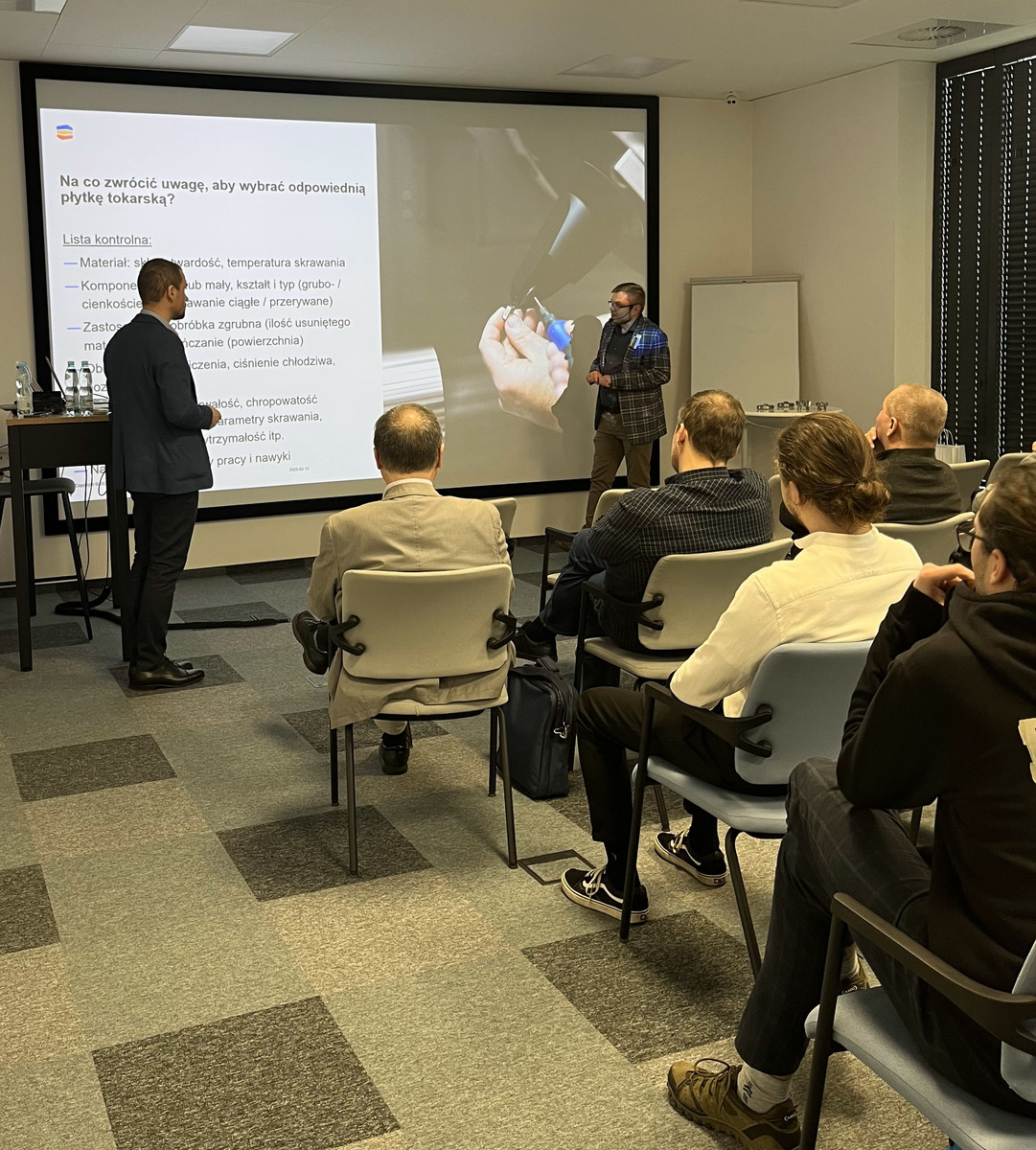 Podczas spotkania swoją wiedzą dzielili się doświadczeni specjaliści z branży. Prelegenci szczegółowo omówili zagadnienia związane z formowaniem wióra oraz wpływem doboru narzędzi i strategii toczenia na jego kontrolę. Dyrektor techniczny Janusz Walczak i STEP Master Michał Łesejko z Seco Tools zaprezentowali wpływ geometrii narzędzia na formowanie wióra oraz praktyczne metody jego kontroli. Omówili także, jak optymalizacja parametrów skrawania może poprawić zarówno jakość obróbki, jak i trwałość narzędzi. Następnie specjalista CAD/CAM Michał Kisiel z Verashape przedstawił zaawansowane możliwości systemu EDGECAM w kontekście nowoczesnego programowania obróbki. Zapoznał uczestników z kluczowymi aspektami wykorzystania oprogramowania CAM w optymalizacji toczenia oraz podkreślił, jak EDGECAM wspiera precyzyjne sterowanie strategią obróbki, zwiększając efektywność i jakość wytwarzania. Kolejny prelegent kierownik sprzedaży ds. klientów kluczowych Stefan Liszka z Machine Tools International zaprezentował park maszynowy firmy, podkreślając znaczenie nowoczesnych obrabiarek w zwiększaniu efektywności procesów obróbkowych.