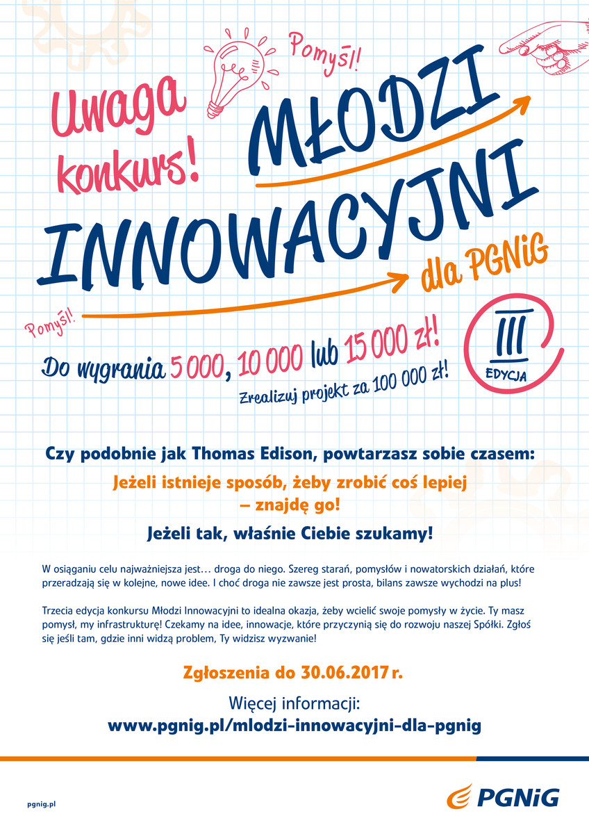 Polskie Górnictwo Naftowe i Gazownictwo SA rozpoczęło III edycję konkursu na projekt badawczo-rozwojowy dla Grupy Kapitałowej PGNiG. W „Młodzi Innowacyjni dla PGNiG” (MIP) mogą wziąć udział młodzi naukowcy, studenci lub doktoranci. Mają stworzyć innowacyjne projekty o charakterze badawczo-rozwojowym. Do zdobycia jest 15 000 zł (I miejsce), 10 000 zł (II miejsce) lub 5000 zł (III miejsce), a na realizację projektu przeznaczone zostanie 100 000 zł. Prace powinny dotyczyć obszaru działalności Grupy Kapitałowej PGNiG, a mianowicie: poszukiwania i wydobycia węglowodorów, dystrybucji paliw gazowych, elektroenergetyki, nowych zastosowań gazu ziemnego, ochrony środowiska, obsługi odbiorców i użytkowników gazu, w tym kwestii bezpieczeństwa, oraz popularyzacji marki PGNiG.